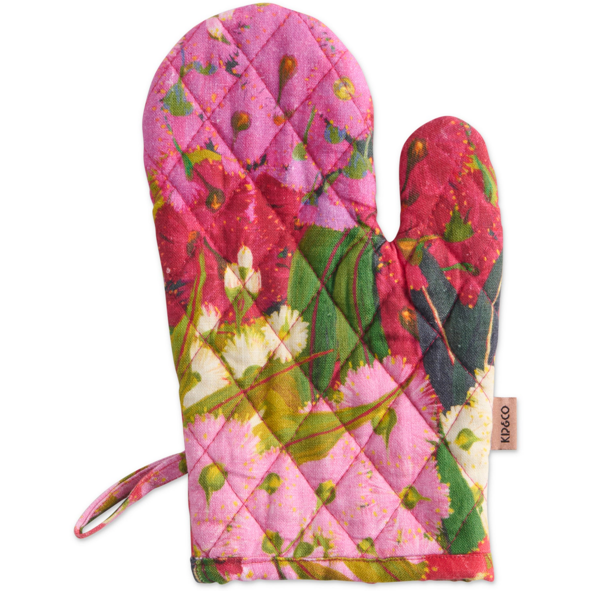 Mitts and the ready! Time to cook up a storm. Keep your precious paws nice and safe with our mega cute and handy oven mitts. Made from a thick cotton canvas and quilted with cotton fill, the Bush Christmas Oven Mitt features gum leaves and blossoms in shades of rich pinks, reds and creamy white.