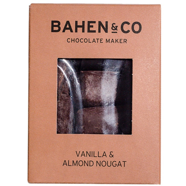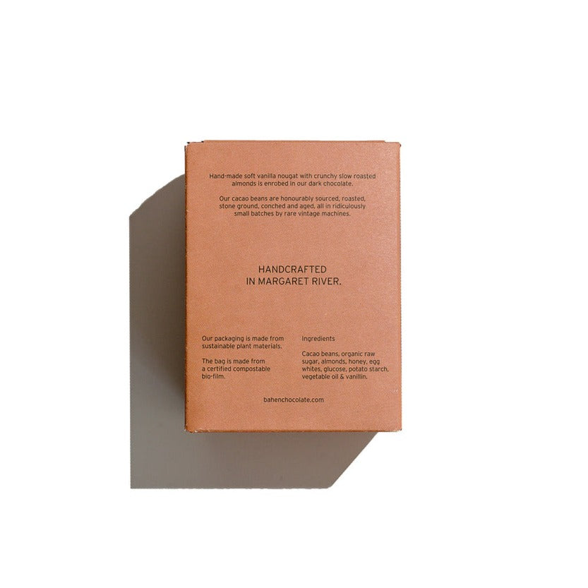 Hand-made soft vanilla nougat with crunchy slow roasted almonds is enrobed in Bahen & Co dark chocolate.