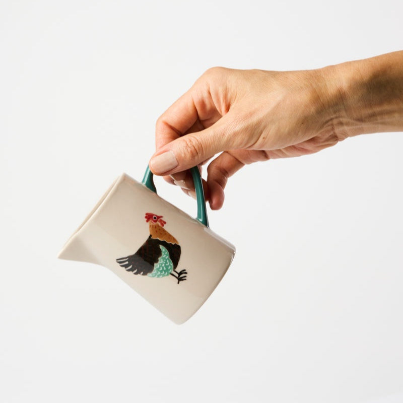 Adorned with a hand-painted rooster in earthy hues, this earthenware milk jug features a distinctive green handle for character and function. The Clover Milk Jug transforms everyday pouring into an occasion, with each piece individually painted.