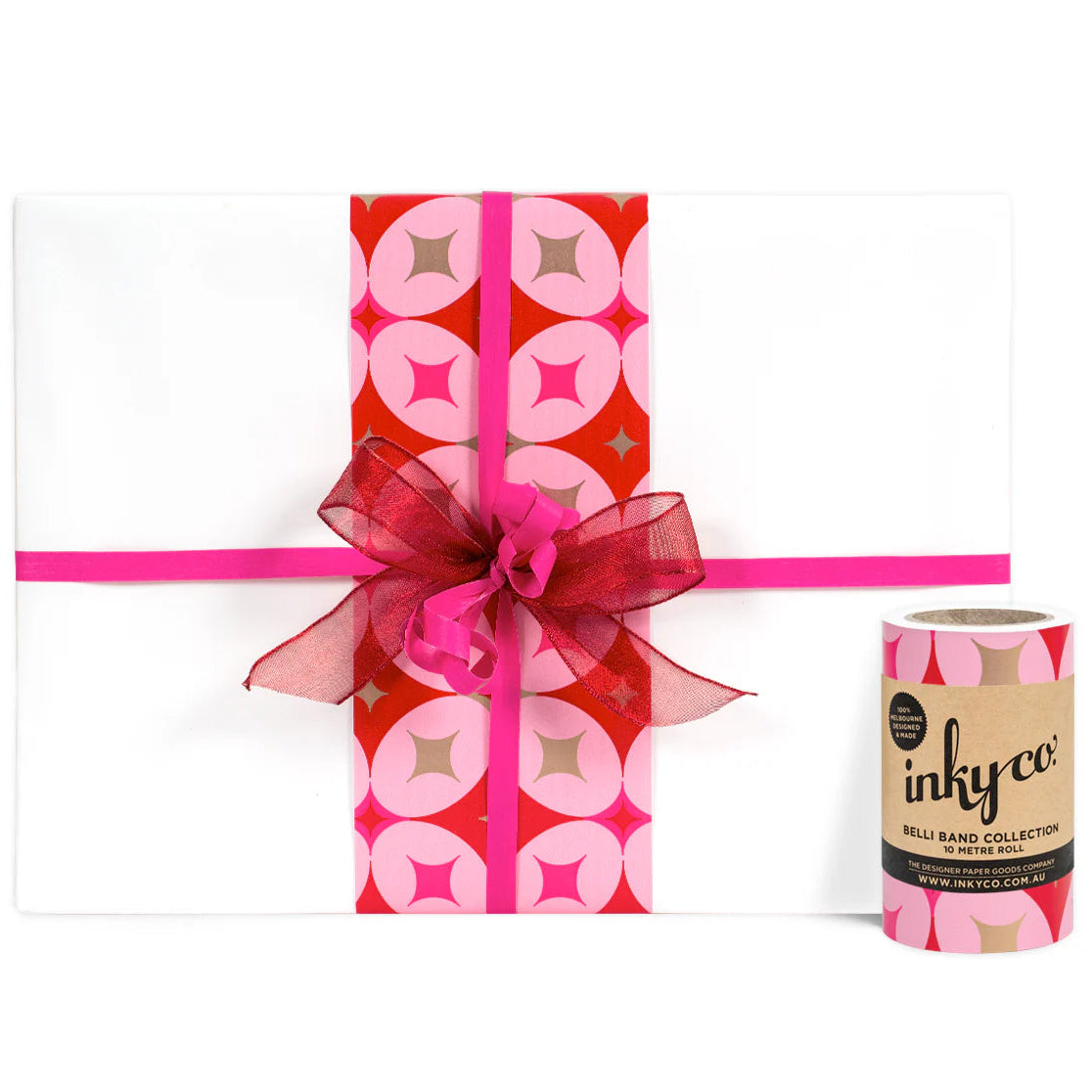 A simple and chic Christmas pattern, Crystal Red Belli-Band is printed in festive shades of red, pink, and gold on white semi gloss wrapping paper. Perfect for all your wrapping and craft needs. Available in a 10 metre roll, it is the perfect paper embellishment for your gift.