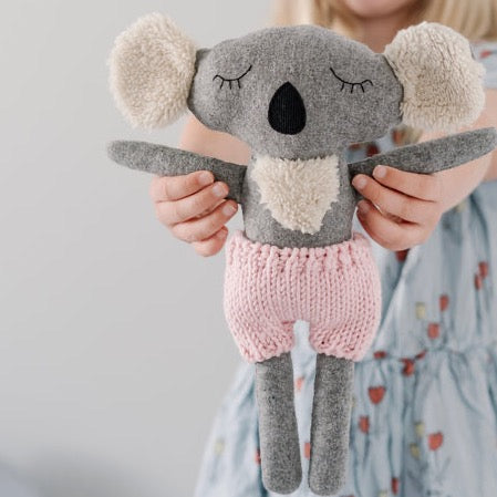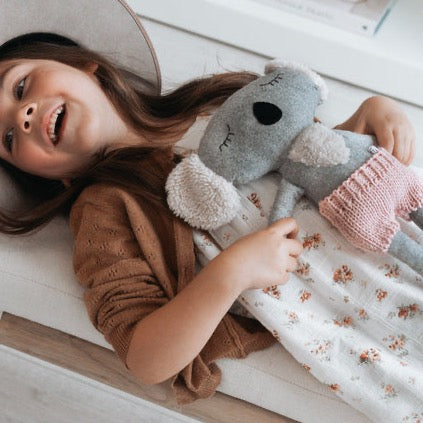 Made with the softest wool blend fabric, Dorothy wears hand knitted Australian merino wool pink pants and has the softest ears.