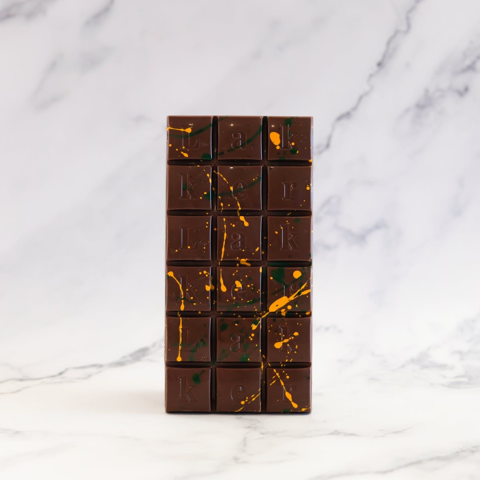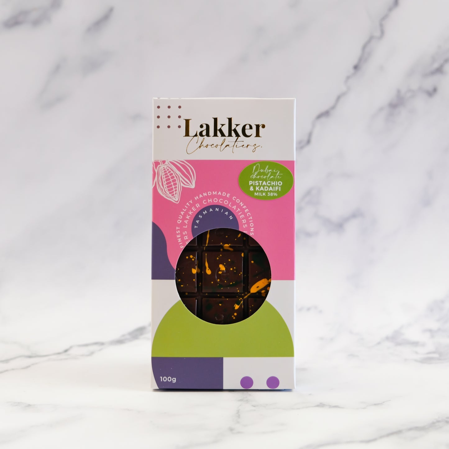 Lakker Chocolatiers create modern confections in Tasmania using the finest cacao and produce. In house made pure Australian pistachio paste and crispy roasted Kadayif pastry moulded in 38% milk chocolate.