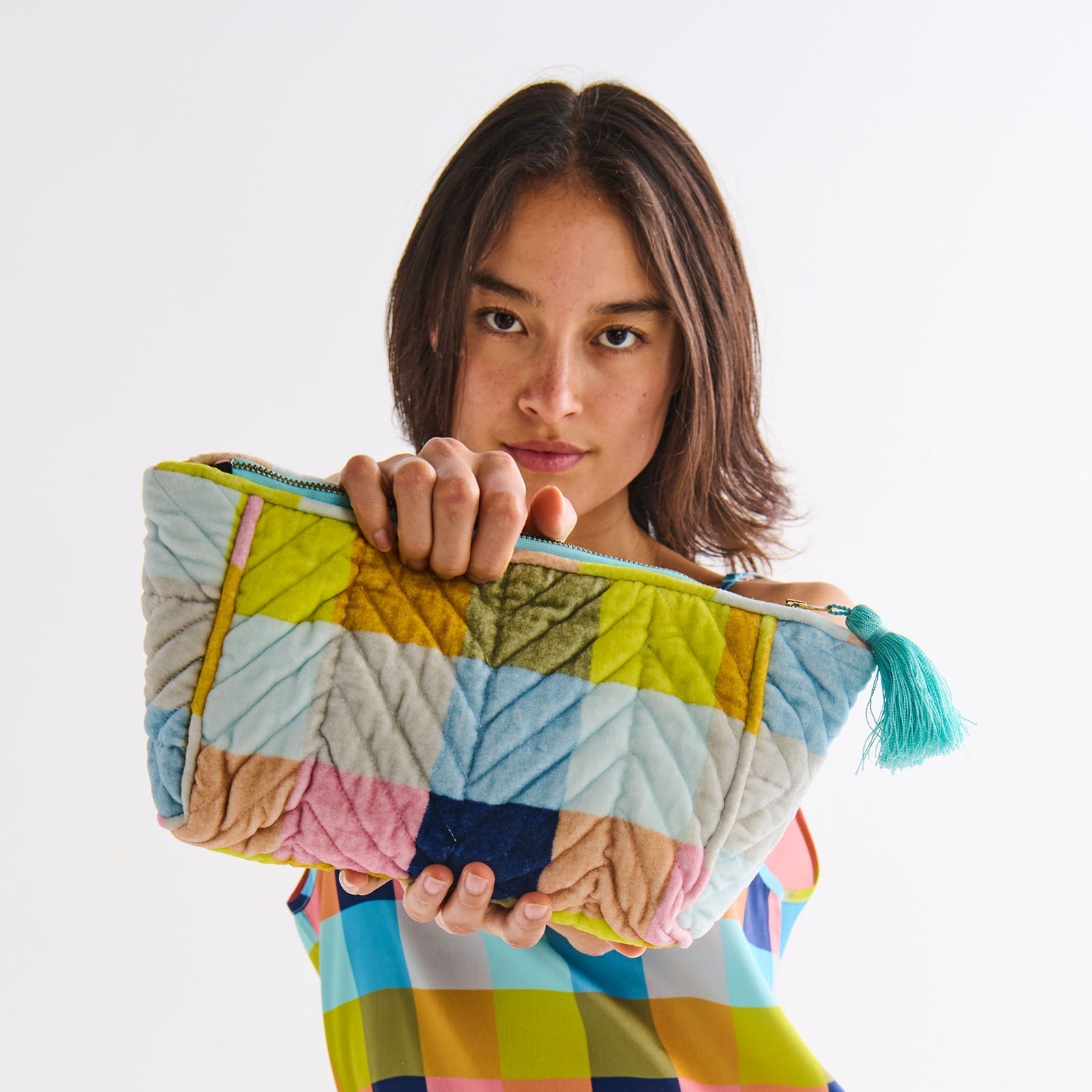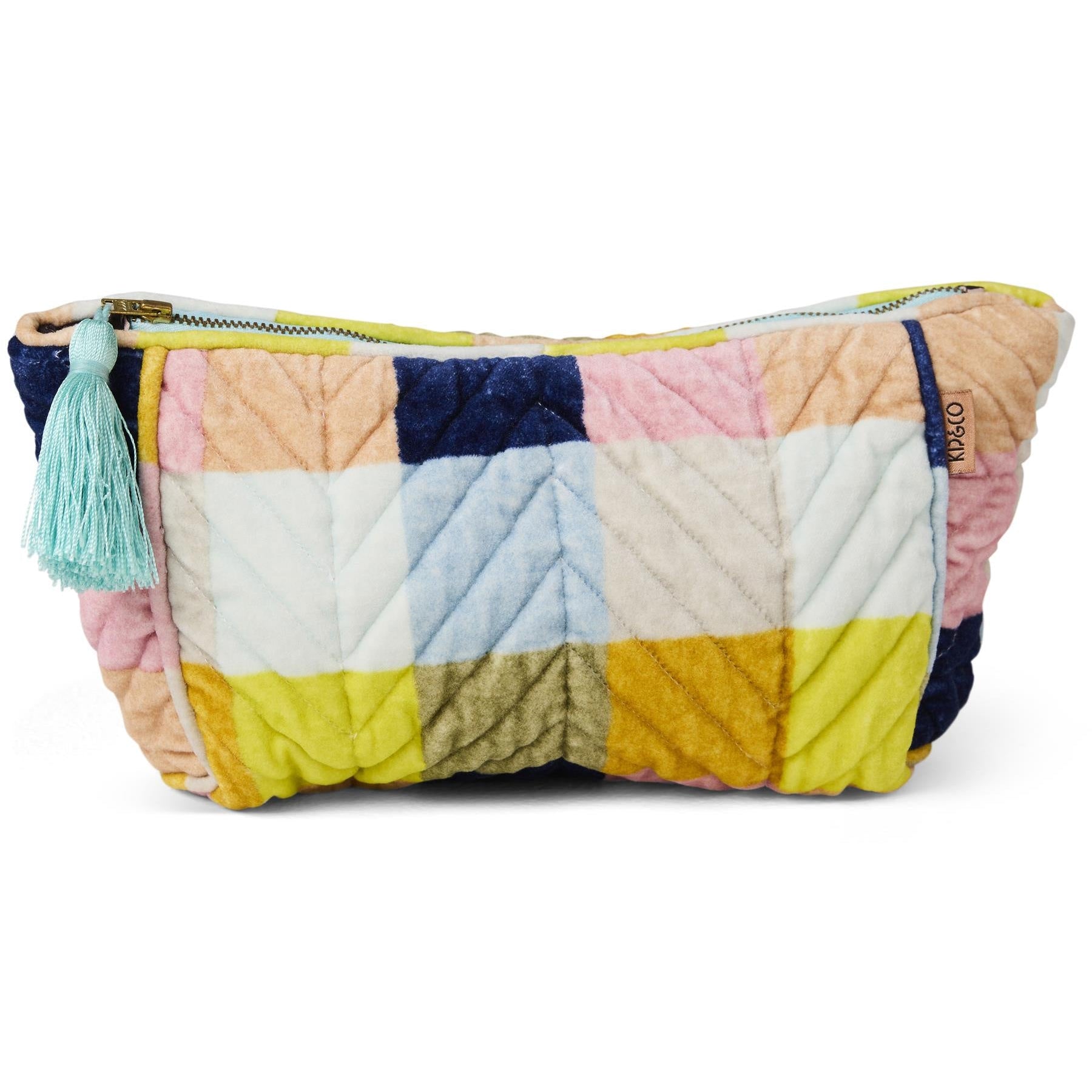 - Velvet toiletry bag with zip closure and feature tassel