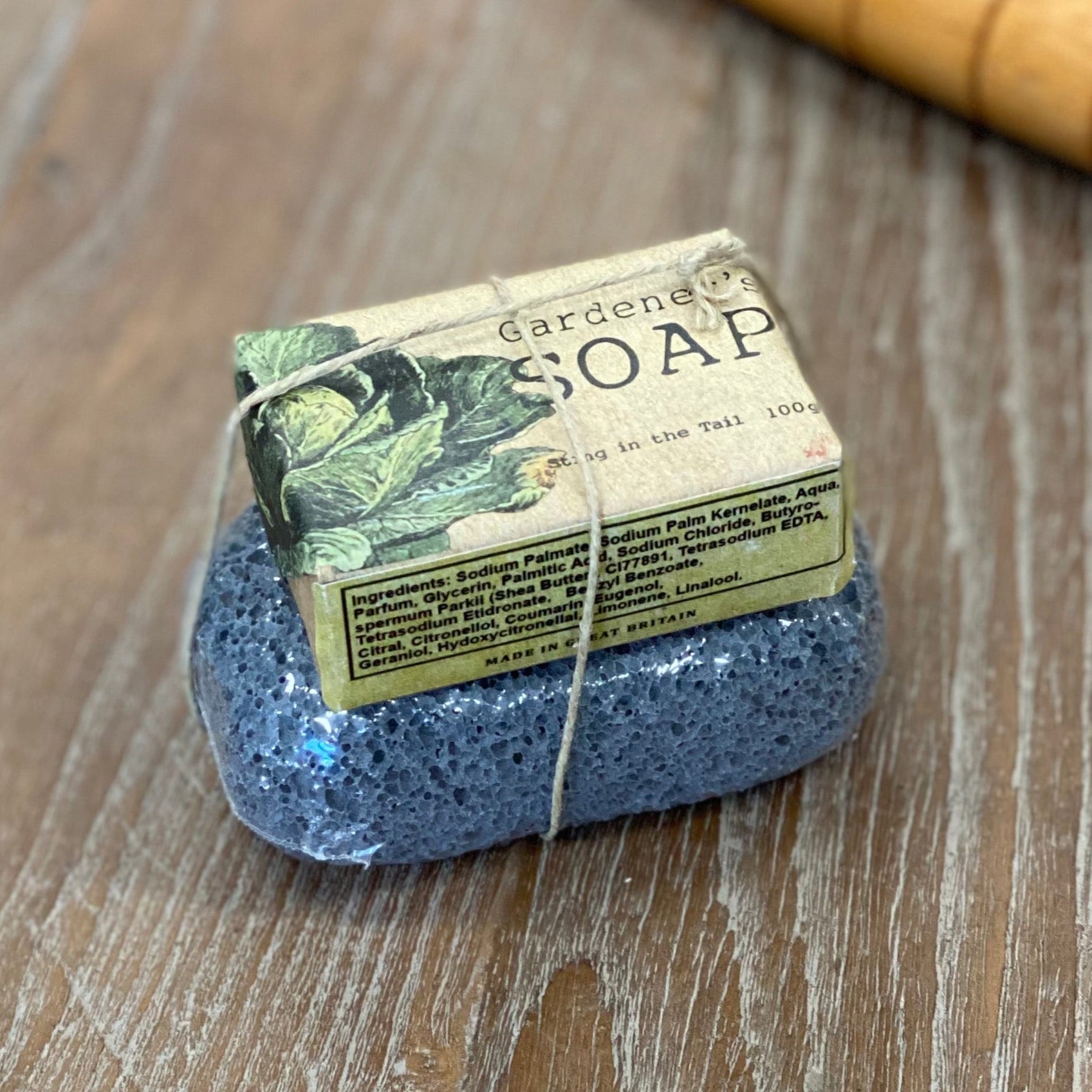 A perfect little combo containing lavender and olive oil Gardner's Soap tied up with a pumice stone.