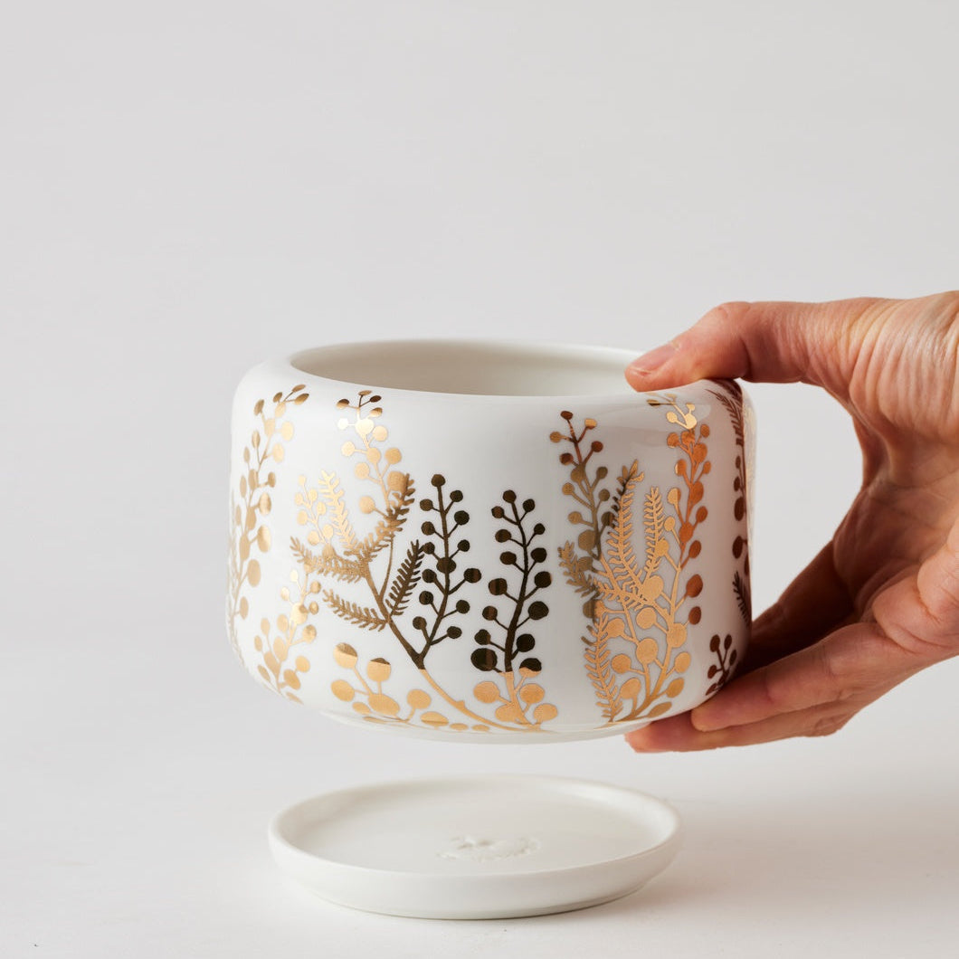 Complete with a delicate drip tray, this smaller sized planter is perfect for bathrooms and shelves or windowsills seeking an extra touch of greenery. Each playful pattern is delicately screen printed from all original Angus & Celeste surface motifs, which are then carefully applied and fired to the surface, making these pots durable for outside use.