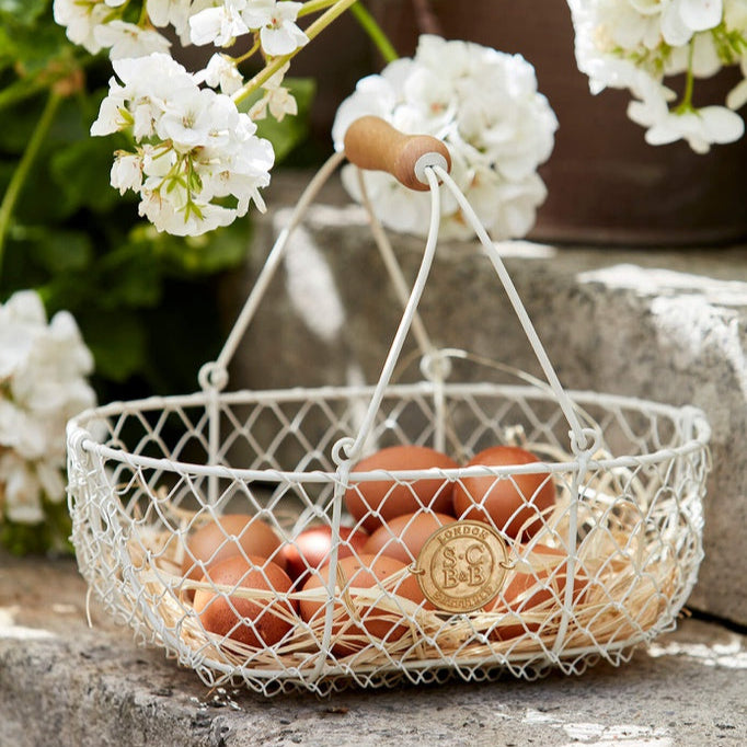 This attractive hand-crafted wire basket is a delight to use. It’s perfect for harvesting tasty treats from the kitchen garden, and it’s just the right size for smaller items, like tomatoes or strawberries, or just the thing for collecting eggs! It’s also ideal for carrying cut flowers, as the open weave allows any water to simply drain through.
