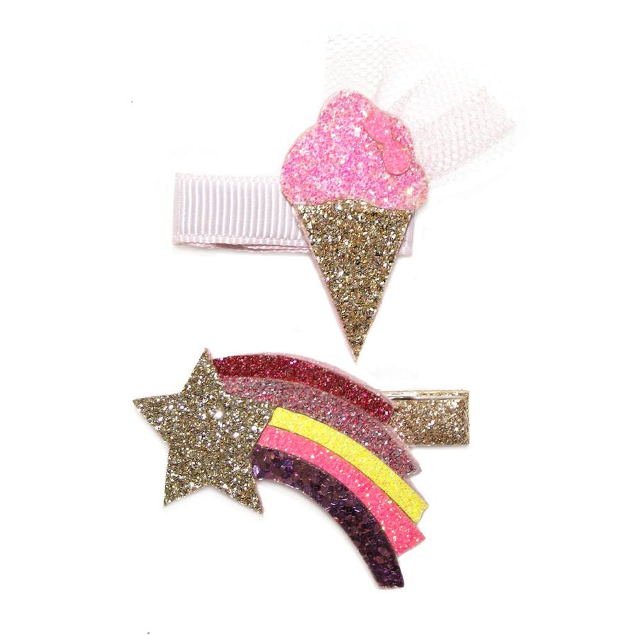 This dazzling pair of glitter clips features one shooting star and one ice cream on strong alligator clips.