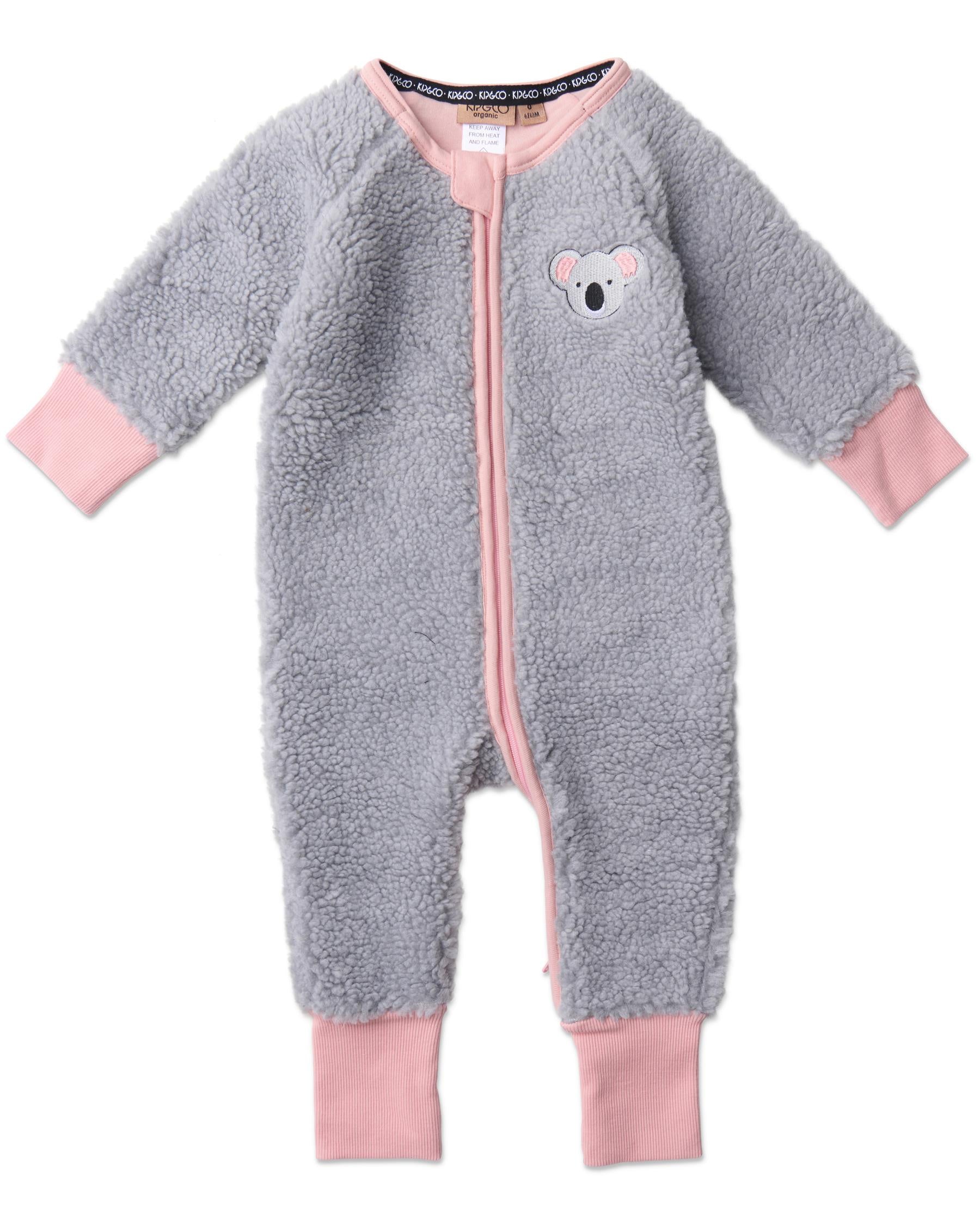 The Koala Sherpa Long Sleeve Zip Romper is made from the coziest recycled polyester sherpa, thick and warm and just calling to be cuddled! Featuring a grey sherpa with embroidered koala face with pale pink cuffs and zip details. This textural winter warmer is all about keeping your baby nice and snug, and oh-so-adorable, with easy-zip feature to ensure fuss-free dressing and quick diaper changes. Pair with booties for a toasty warm fit suitable for all-kinds of winter days at home or out and about.