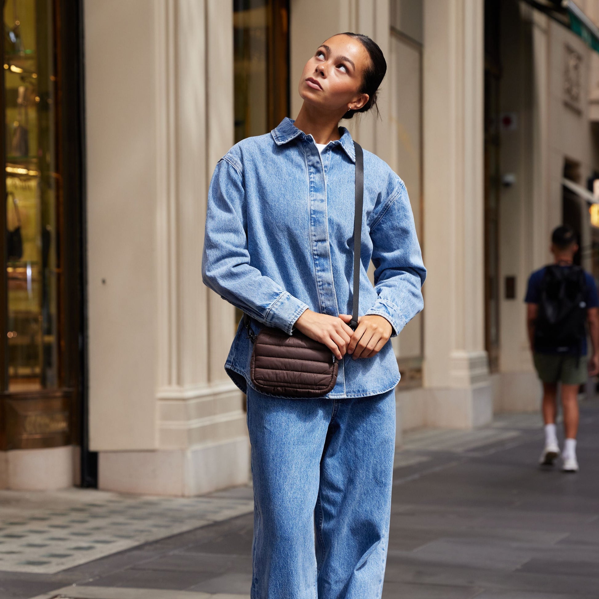 The mini base updates Base Supply's signature small crossbody bag in soft, cloud-like fabric. A versatile design, mini base is the handsfree carrier for your phone, cards, keys and glasses. Perfect for grabbing coffee, hitting the markets or walks ‘round the streets.