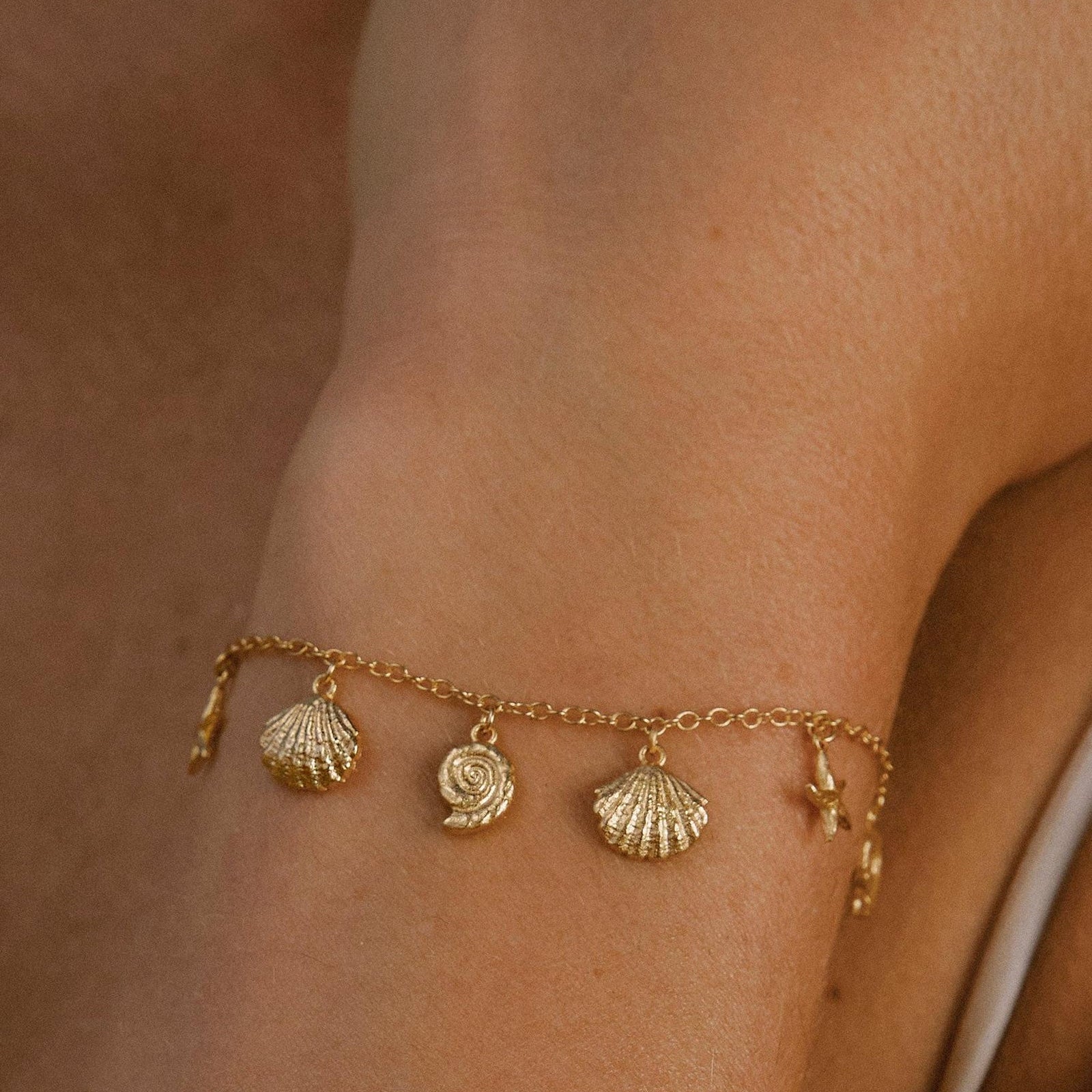 A dainty chain bracelet with five small sea-inspired pendants. Finely detailed seashells and starfish, like treasures washed ashore.