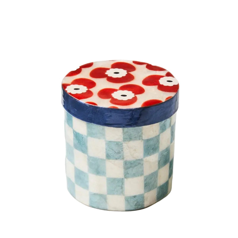 Serene blue checks wash across the sides of this perfectly sized Capiz shell box, with the hand painted red flowers on the lid creating a playful statement while holding your small treasures. Hand-crafted by skilled artisans, each piece harnesses the natural iridescence of the shell while bringing modern sensibilities to bedside tables and vanities.