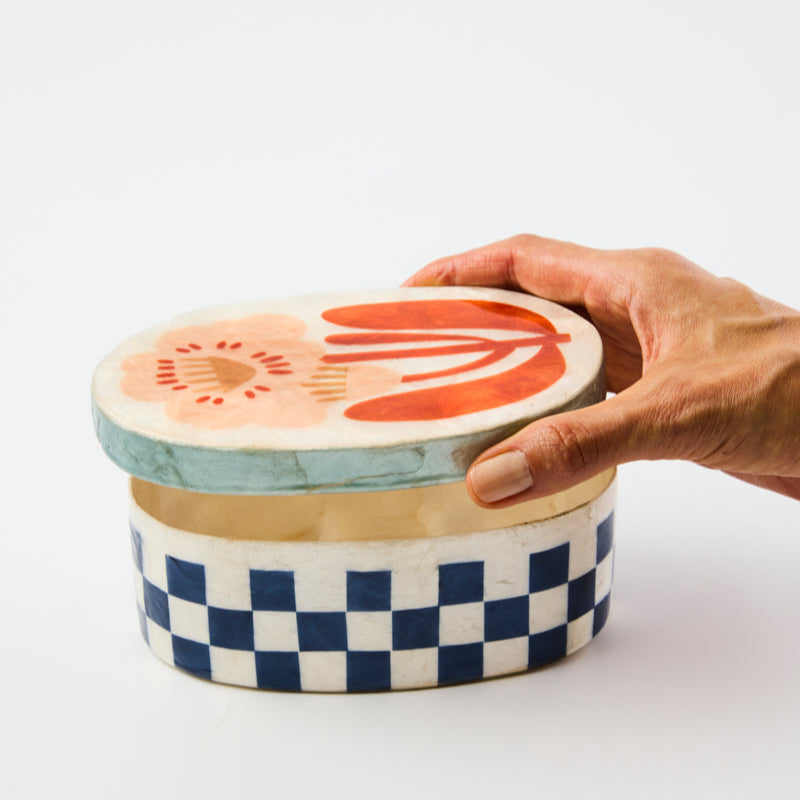 Deep maritime blue checks give this generous Capiz shell box sophisticated presence on vanities and shelves. Hand-crafted by skilled artisans, each piece celebrates the natural luminosity of the shell through rich colour, like the fun floral motif top. Perfect for organising jewellery, mementos, or special treasures while adding a touch of playful colour.