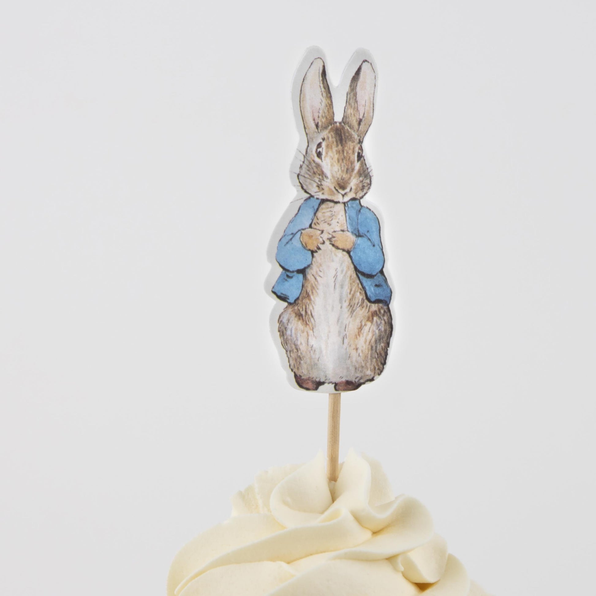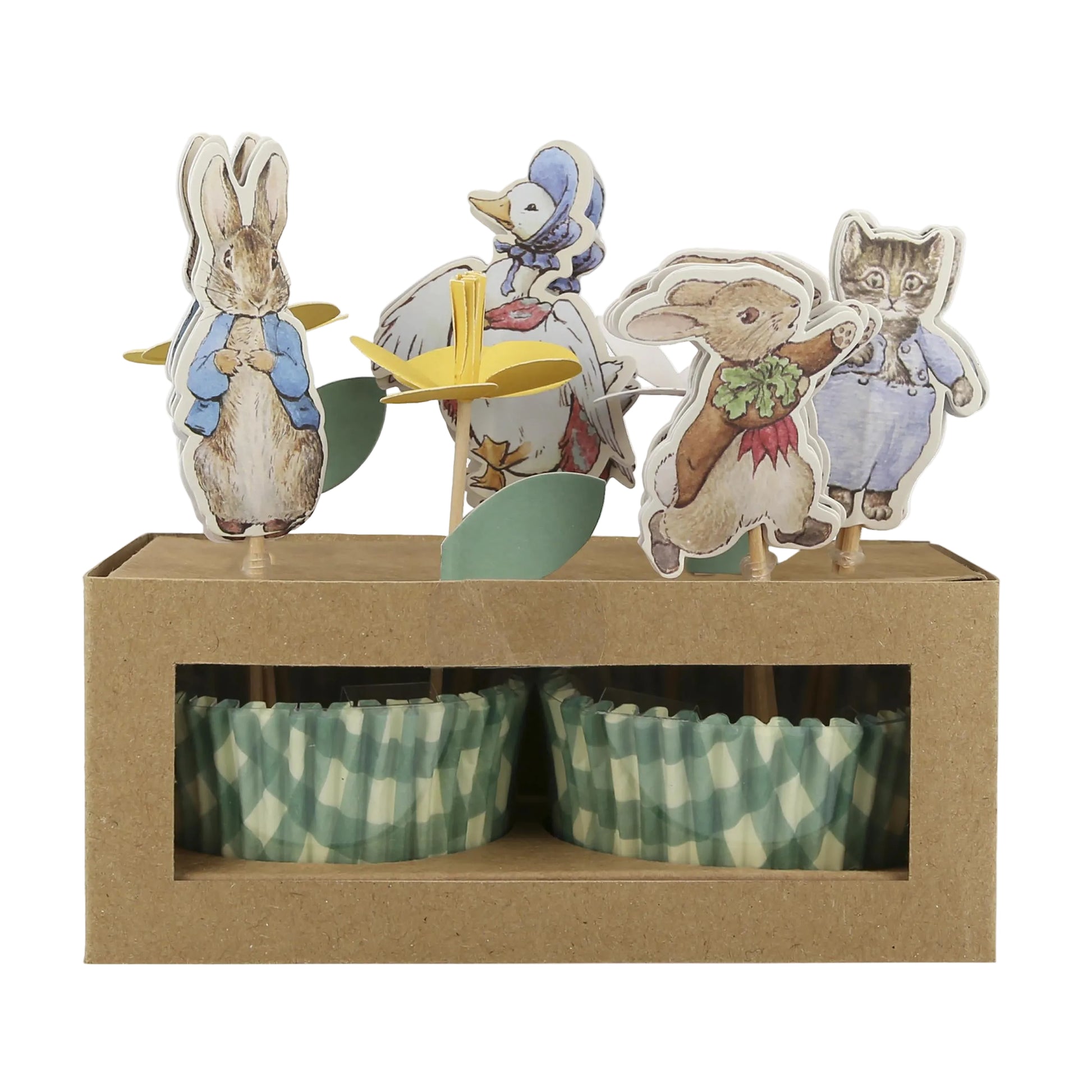 - 6 Different topper designs: 6 x Peter Rabbit, 5 x Jemima Puddleduck, 5 x Tom Kitten, 5 x Benjamin Bunny, 2 x yellow flowers and a white flower.