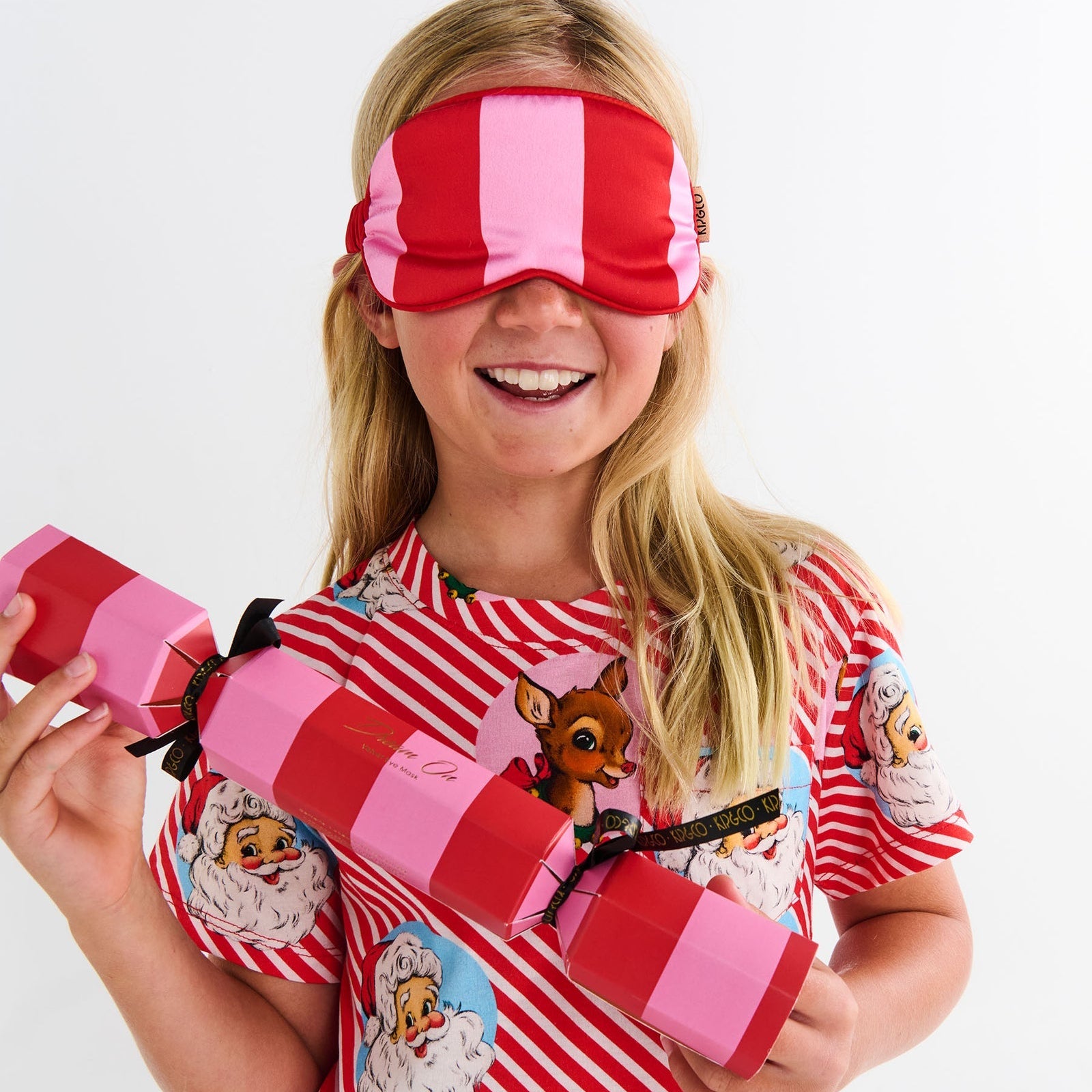 Slip into holiday bliss! The Santa Baby Satin Eye Mask is silky soft, sumptuous, and superb for shutting out the world and resting up for the silly season ahead. Perfect for pre-Christmas power naps or sunny summer lie-ins, this little mask turns every snooze into a sweet and festive escape. Made from recycled eco satin polyester in bold pink and red stripes with a red satin backing and covered elastic headband.