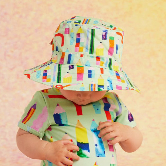 Play safe in the sun this summer with this adjustable bucket hats for babies and kids. Features a wide brim, adjustable head circumference and chin ties with safety toggle to grow with your child.