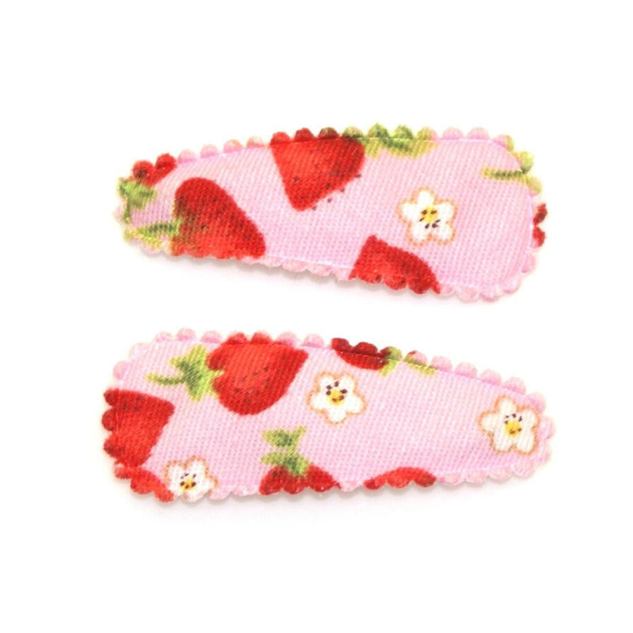 A pair of small non-slip hair snaps covered in fabric with strawberries on a pink background.