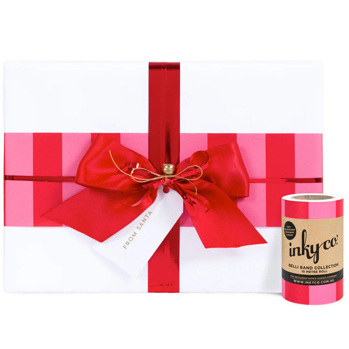 Stripe Pink Belli-Band features a thick red stripe over a pink background, printed on matt white wrapping paper. Perfect for all your wrapping and craft needs. Available in a 10 metre roll, it is the perfect paper embellishment for your gift.