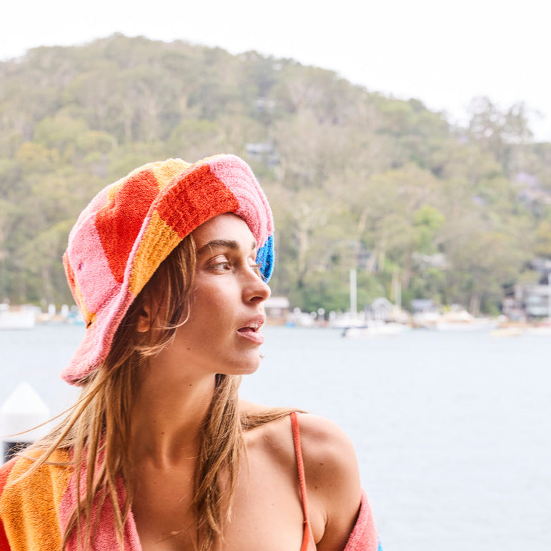 The Surfs Up Terry Beach Hat is your summer go-to for sun-soaked days and salty adventures. Made from soft, 100% cotton terry towelling with a curvy wave pattern of red, golden yellow, melon pink and blue, it’s equal parts comfy and cool, with a wide brim to keep the rays at bay while you lap up the lush warm days. Perfect for beach strolls, poolside lounging or post-swim hair hiding (we get it), this hat brings the fun and function in one sunny little package. Just add SPF and you’re set!