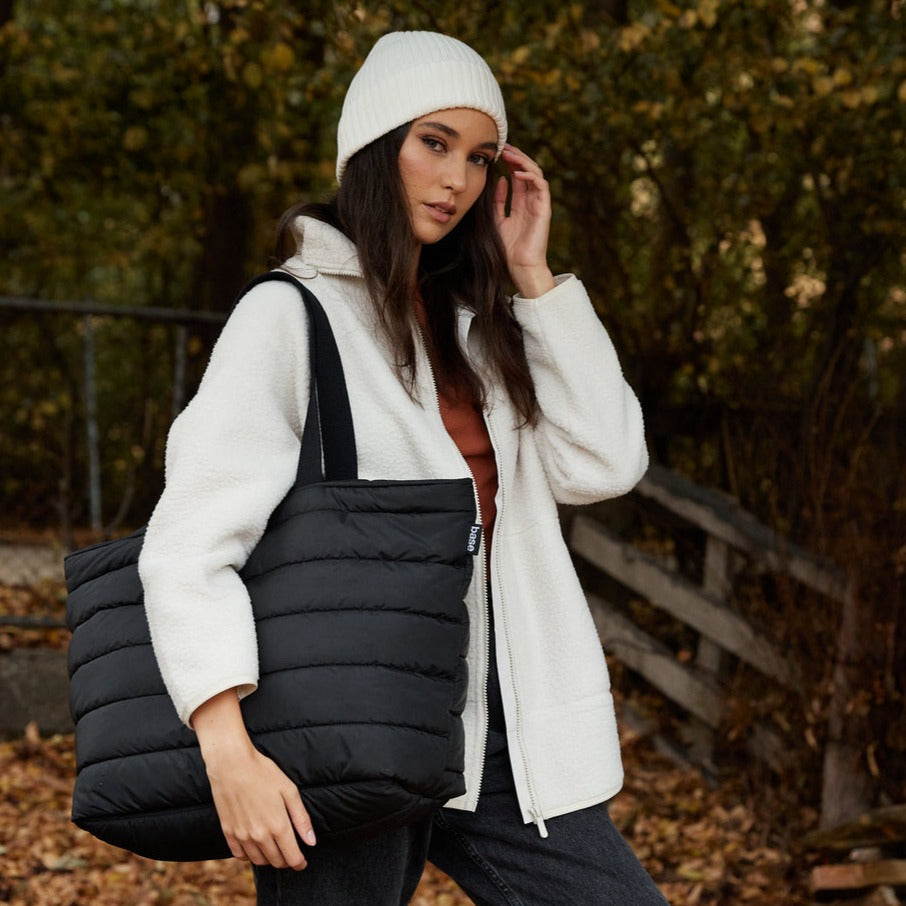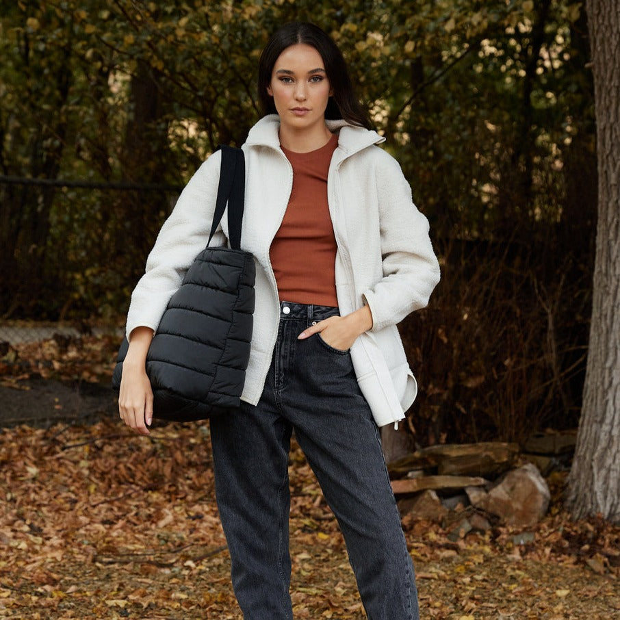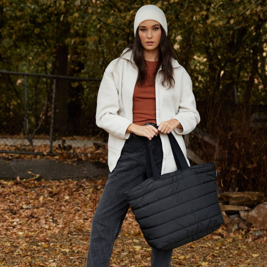 The chunky zip closure keeps everything contained while soft cotton shoulder straps deliver carrying comfort. Ultra-lightweight, cloud-like padding adds fun to the functionality of this everyday tote bag.