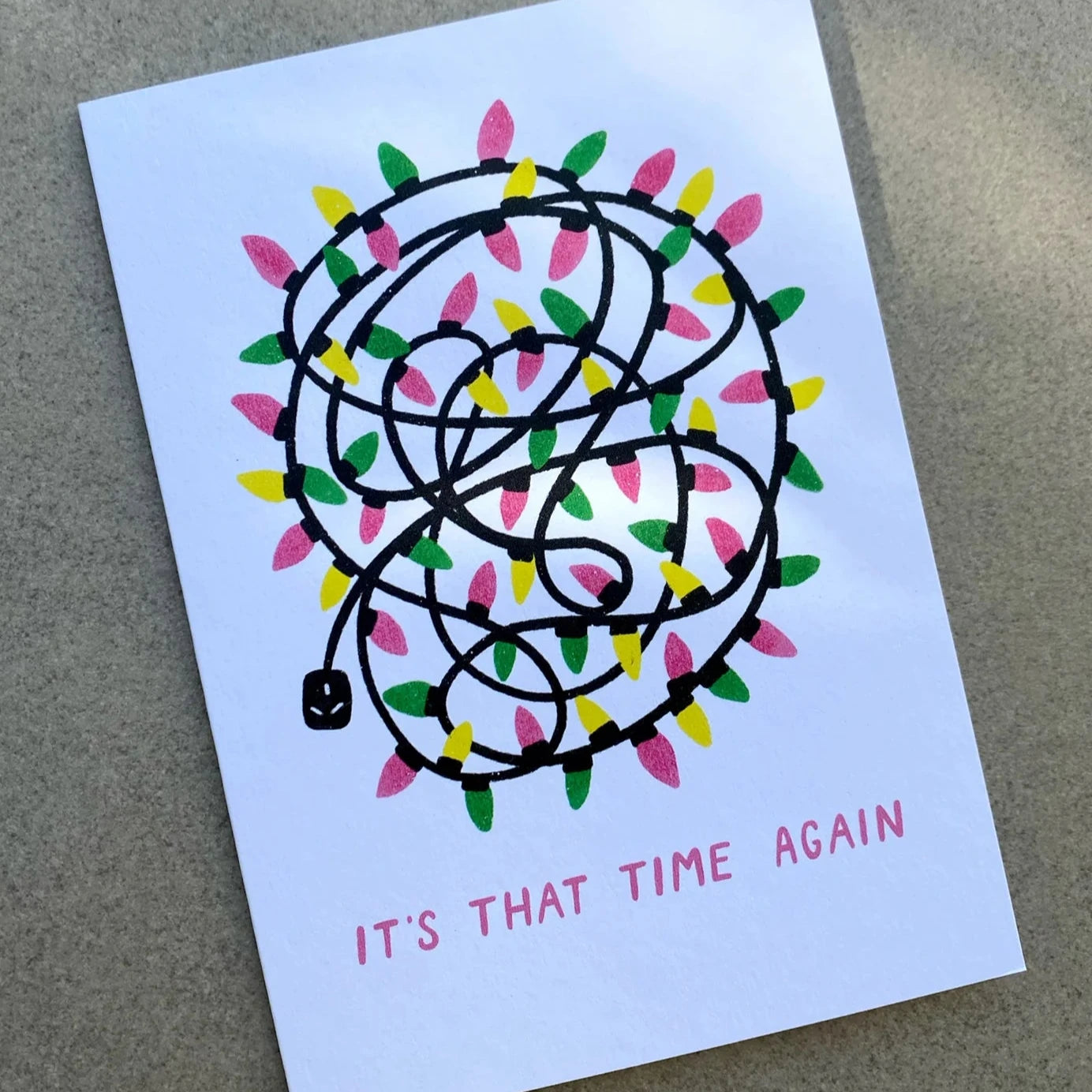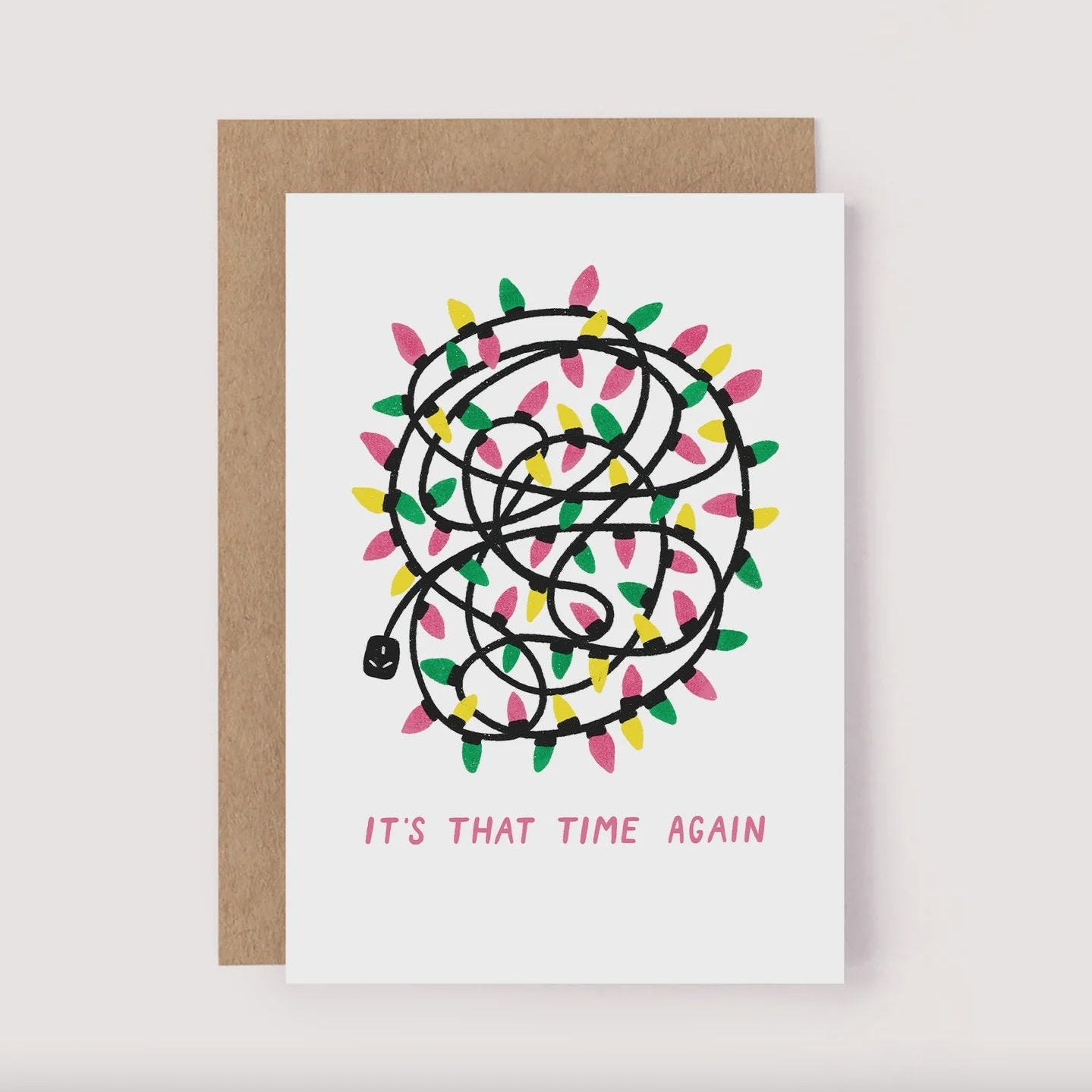This holidays card is a relatable one! Featuring an illustrated pile of tangled Christmas fairy lights with the greeting "It's That Time Again".