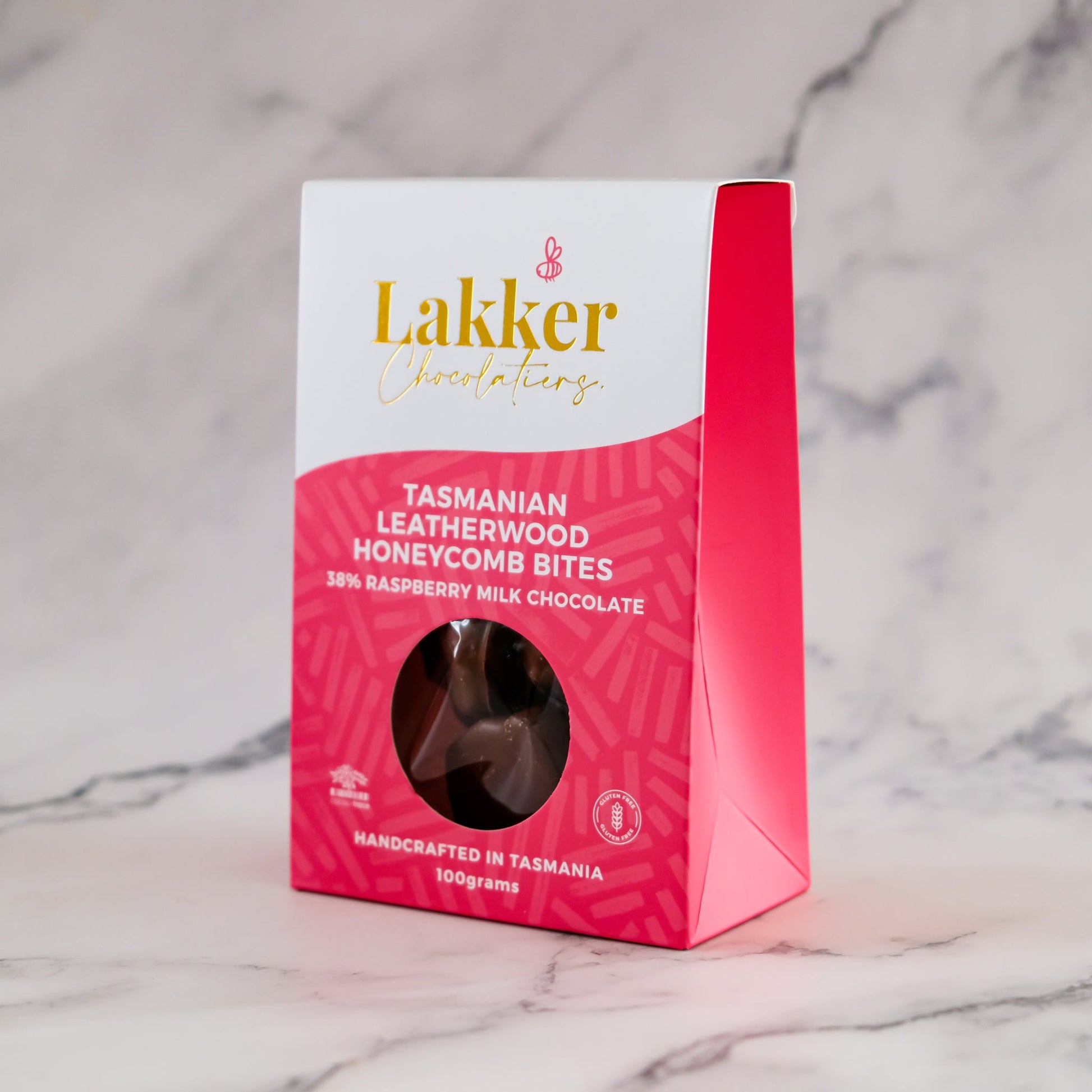 Leatherwood Honey from the pristine Tasmanian South West Wilderness is slowly caramelised and aerated to make a crunchy honey toffee. These delicious bites get dipped in milk chocolate blended with Tasmanian raspberries.