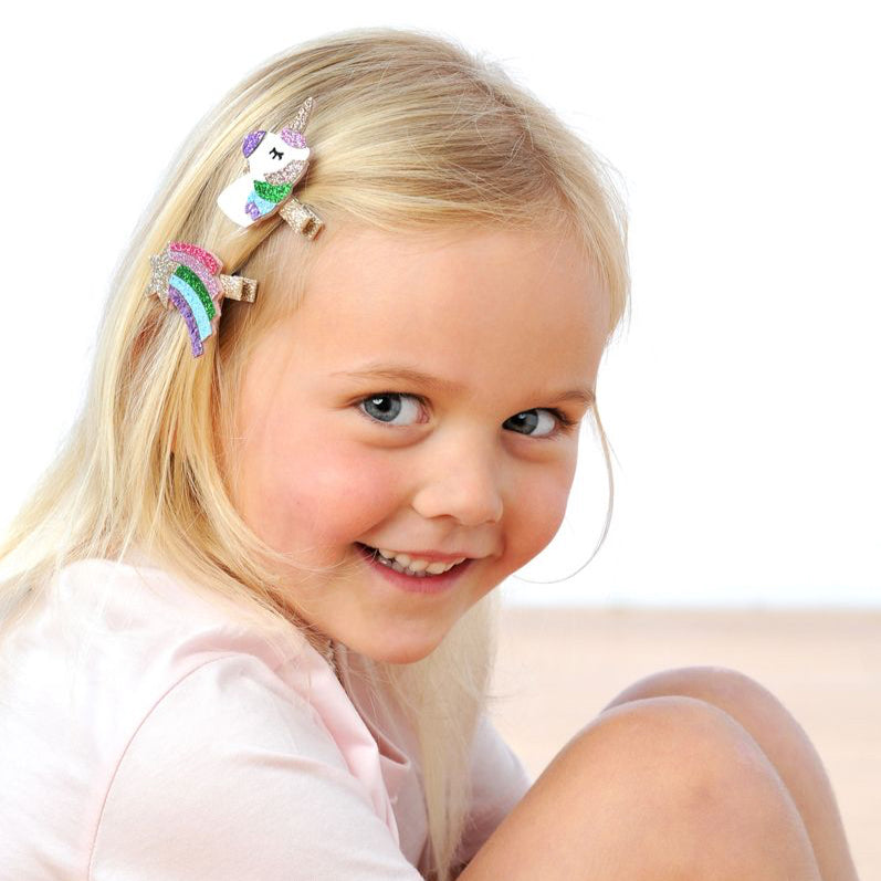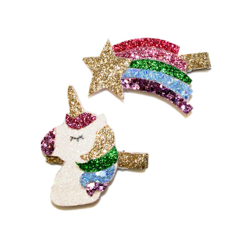 This dazzling pair of glitter clips features one shooting star and one unicorn on strong, glitter-covered alligator clips.