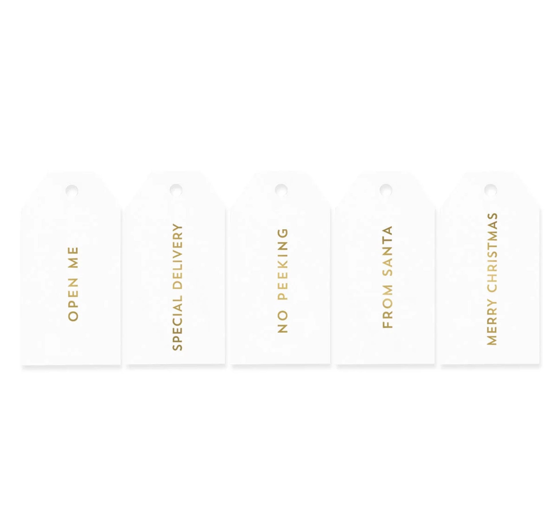 Pack of ten mixed Christmas gift tags. Letterpress printed with gold foil on white matt gift tags. Printed on white card stock.